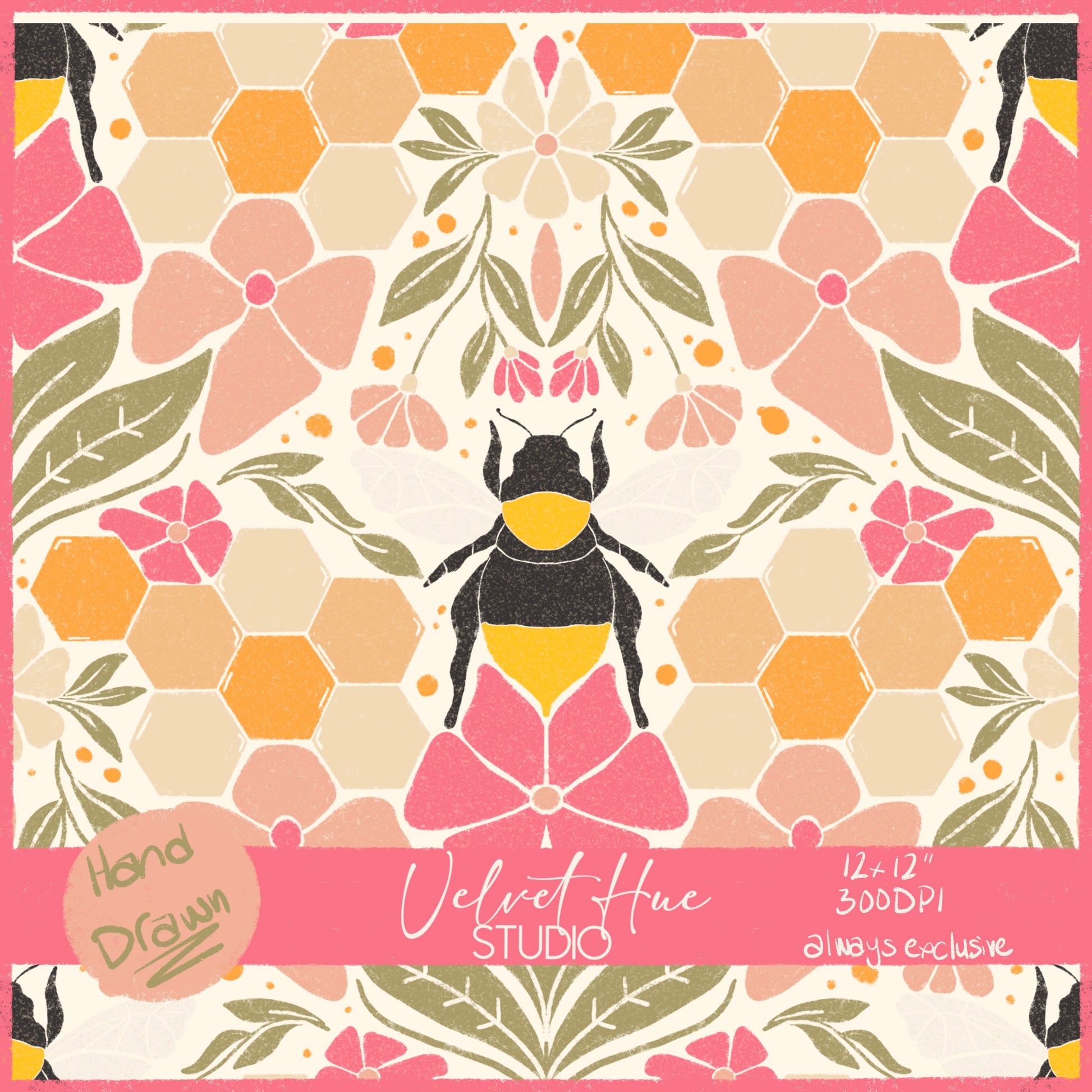 Spring will be here before you know it and what better time to get ready than right now! Hand drawn mosaic style whimsical bees and florals, and greenery. Perfect for fall dresses, bags, kids clothing, and so much more.