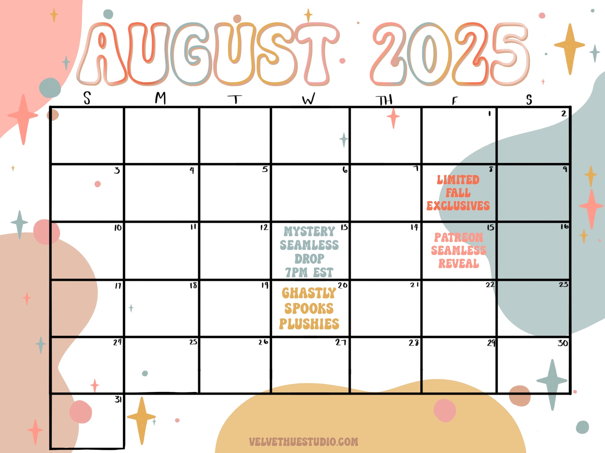 Hand drawn digital calendar for the month of August 2025. Please do not share this, instead invite others to download their own copy of the calendar.